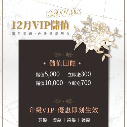 12 月限定活動|VIP 儲值回饋 儲值方案 .儲值 5,000 ➜ 送 300 .儲值 10,000 ➜ 送 700 儲值即升級 VIP 會員 享指定專案 剪 / 燙 / 染 / 護 9 折優惠 (優惠立即生效,12 月最划算) 名額有限・額滿即止